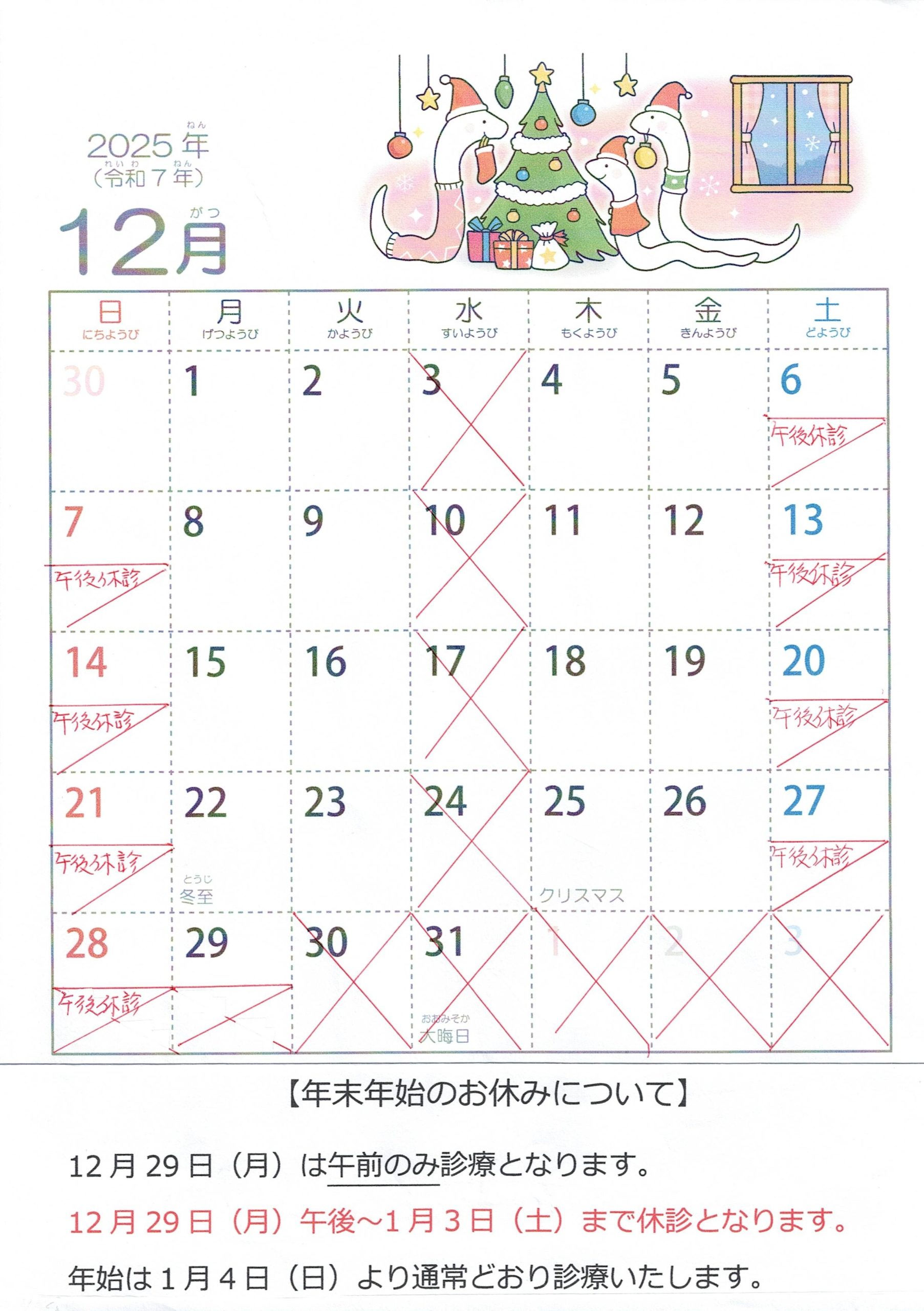 2025年12月の診療カレンダーです。水曜日の休診日、土曜午後休診、年末年始のお休みをご確認ください。