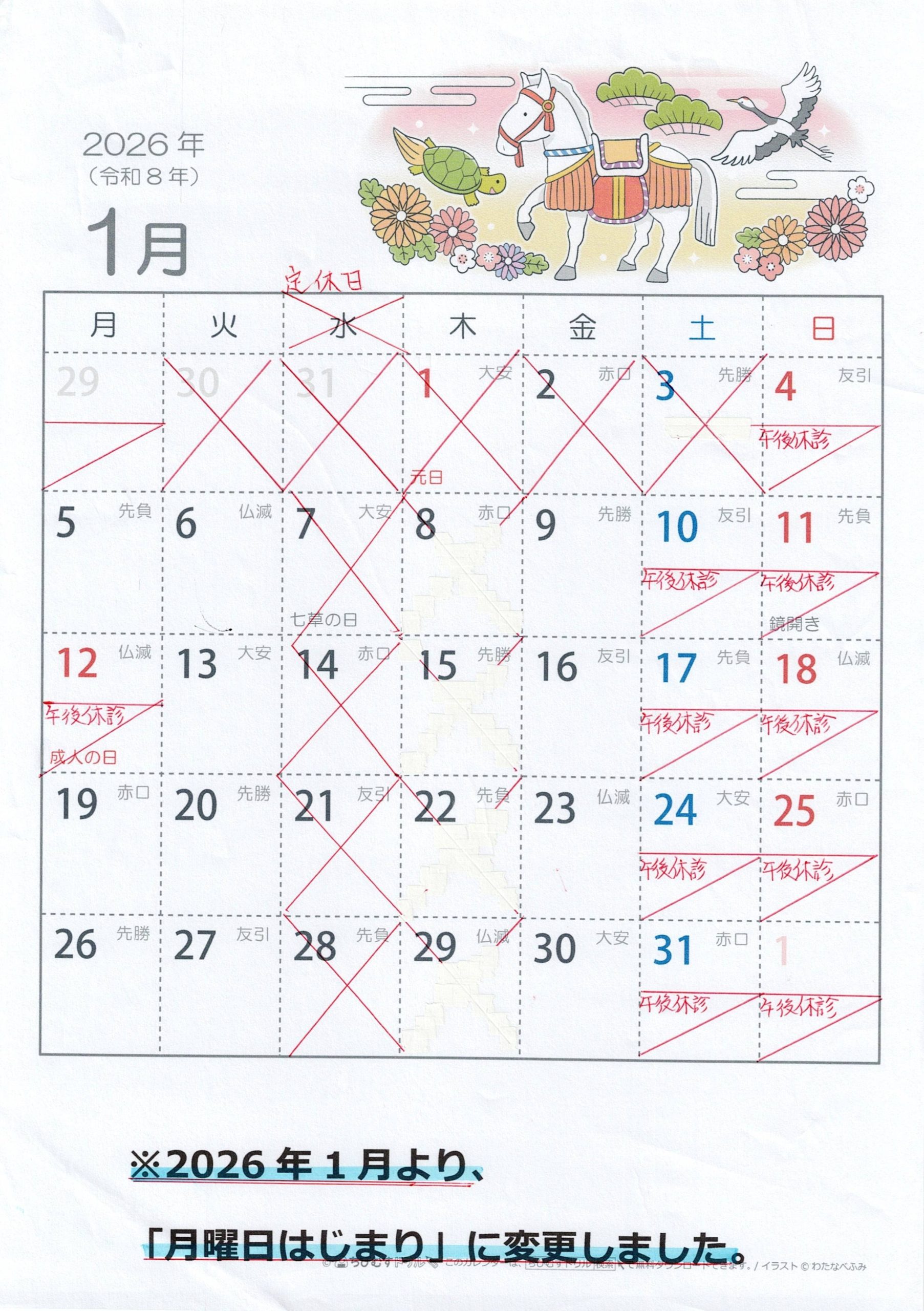 2026年1月の診療カレンダーと年末年始の診療について