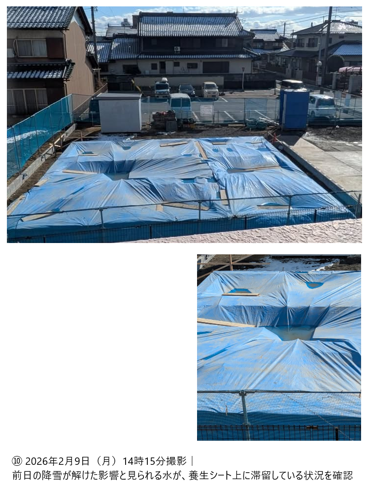 前日の降雪が解けた影響と見られる水が、養生シート上に滞留している状況を確認。